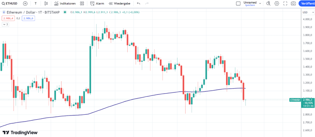 (Der Kurs von $ETH ist unter den EMA 200 und die Marke von 3.000 Dollar gefallen. 2 sehr wichtige Unterstützungen – Quelle: Tradingview.com)